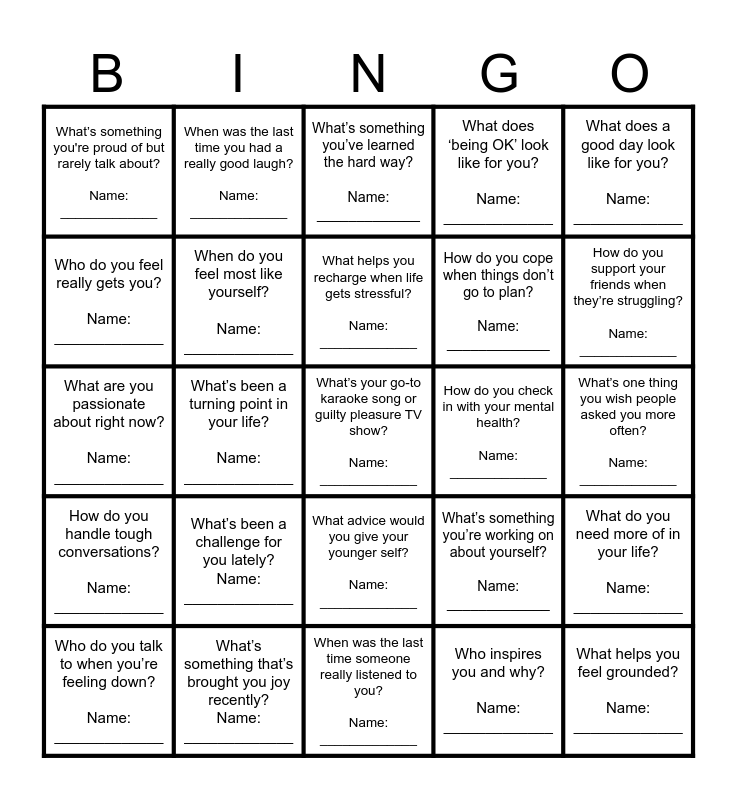 This bingo card has a free space and 24 words: What’s been a challenge for you lately? Name: _____________, What’s something that’s brought you joy recently? Name: _____________, What helps you recharge when life gets stressful? Name: _____________, Who do you talk to when you’re feeling down? Name: _____________, What does a good day look like for you? Name: _____________, What’s something you're proud of but rarely talk about? Name: _____________, Who do you feel really gets you? Name: _____________, When was the last time you had a really good laugh? Name: _____________, How do you check in with your mental health? Name: _____________, What advice would you give your younger self? Name: _____________, How do you cope when things don’t go to plan? Name: _____________, What are you passionate about right now? Name: _____________, What’s something you’re working on about yourself? Name: _____________, What do you need more of in your life? Name: _____________, When do you feel most like yourself? Name: _____________, Who inspires you and why? Name: _____________, What’s one thing you wish people asked you more often? Name: _____________, What’s something you’ve learned the hard way? Name: _____________, How do you support your friends when they’re struggling? Name: _____________, What’s been a turning point in your life? Name: _____________, What helps you feel grounded? Name: _____________, How do you handle tough conversations? Name: _____________, What does ‘being OK’ look like for you? Name: _____________ and When was the last time someone really listened to you? Name: _____________.
