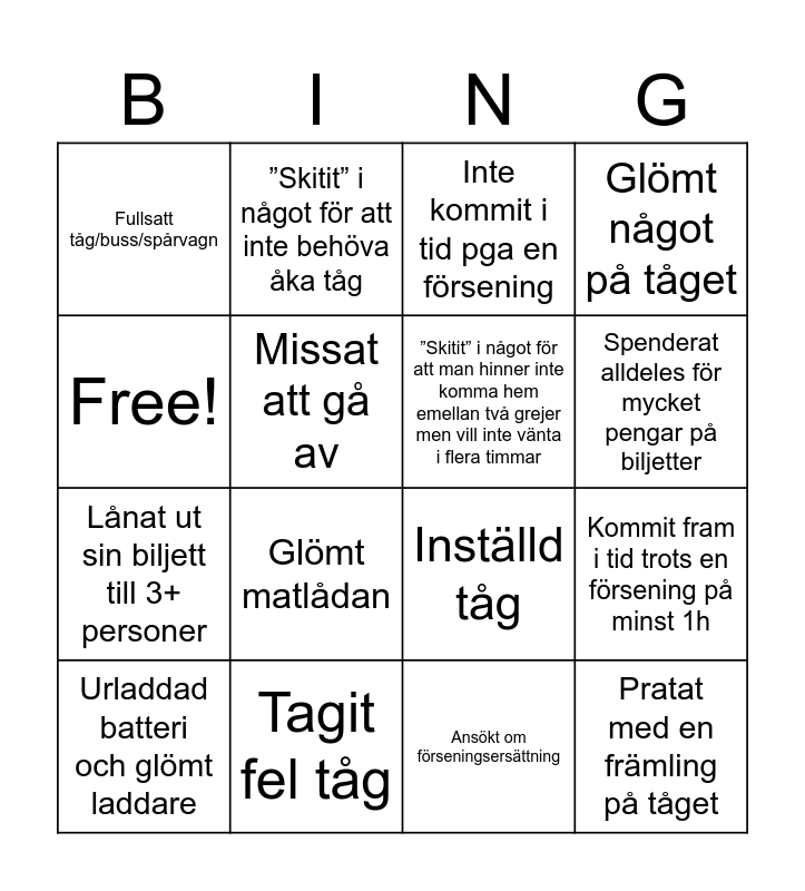 This bingo card has 16 words: Tagit fel tåg, Kommit fram i tid trots en försening på minst 1h, Inte kommit i tid pga en försening, Fullsatt tåg/buss/spårvagn, Lånat ut sin biljett till 3+ personer, ”Skitit” i något för att inte behöva åka tåg, Inställd tåg, Ansökt om förseningsersättning, Free!, Missat att gå av, Urladdad batteri och glömt laddare, Glömt något på tåget, Glömt matlådan, Spenderat alldeles för mycket pengar på biljetter, ”Skitit” i något för att man hinner inte komma hem emellan två grejer men vill inte vänta i flera timmar and Pratat med en främling på tåget.