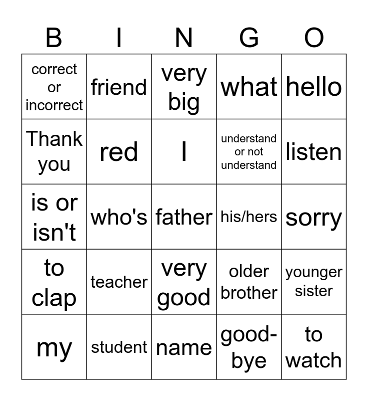 This bingo card has a free space and 24 words: teacher, student, I, my, hello, correct or incorrect, Thank you, friend, his/hers, very good, understand or not understand, is or isn't, older brother, younger sister, red, good- bye, sorry, very big, listen, who's, to watch, to clap, what and name.