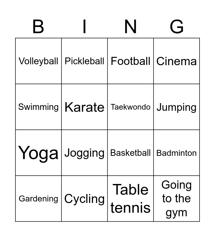 This bingo card has 16 words: Cycling, Badminton, Football, Volleyball, Yoga, Pickleball, Basketball, Table tennis, Swimming, Karate, Gardening, Cinema, Jogging, Jumping, Taekwondo and Going to the gym.