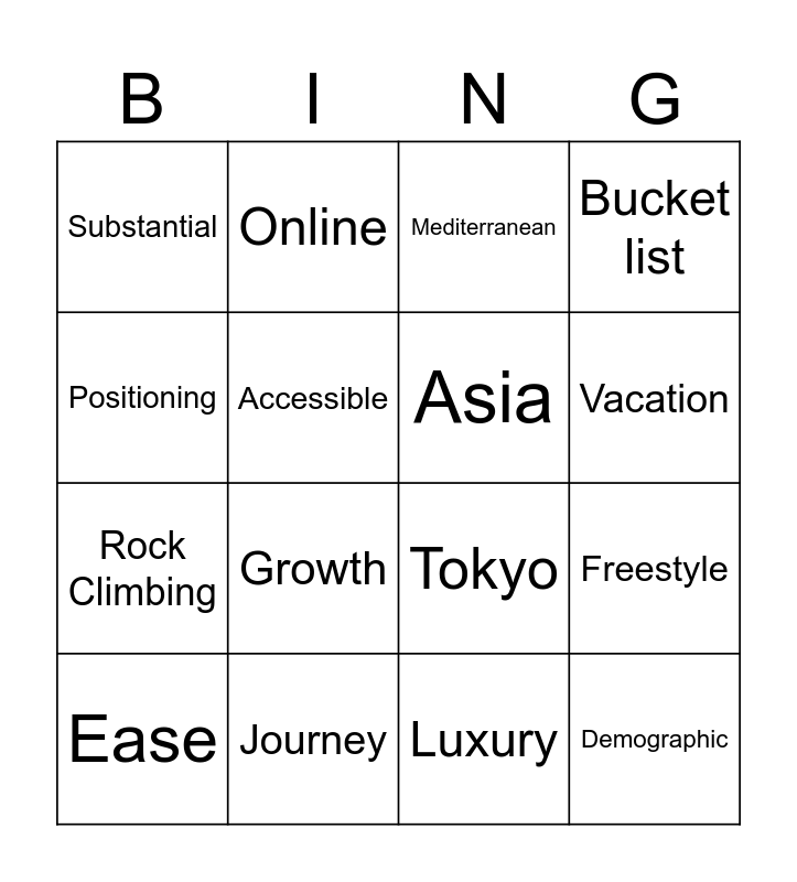 This bingo card has 16 words: Journey, Freestyle, Mediterranean, Substantial, Rock Climbing, Online, Tokyo, Luxury, Positioning, Accessible, Ease, Bucket list, Growth, Vacation, Asia and Demographic.