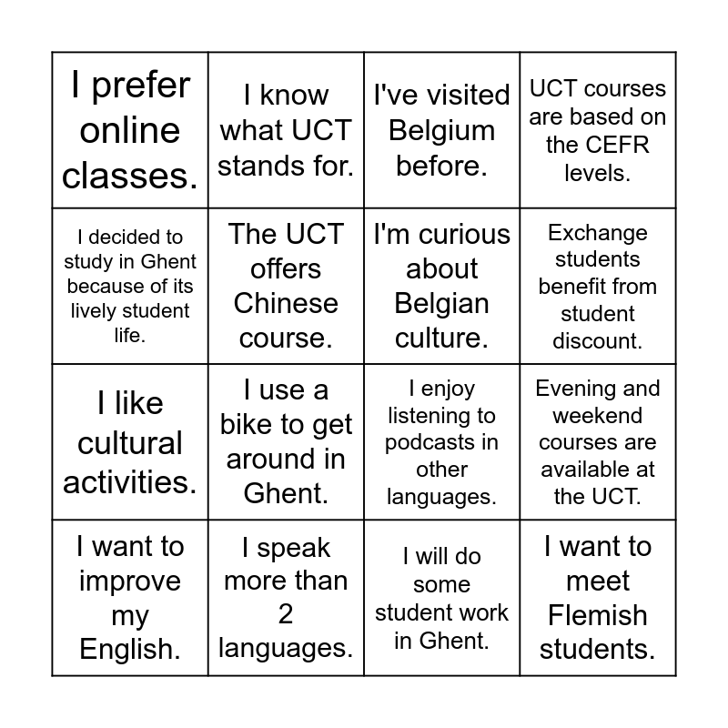 This bingo card has 16 words: I speak more than 2 languages., Evening and weekend courses are available at the UCT., I've visited Belgium before., I prefer online classes., I like cultural activities., I know what UCT stands for., I enjoy listening to podcasts in other languages., I will do some student work in Ghent., I decided to study in Ghent because of its lively student life., The UCT offers Chinese course., I want to improve my English., UCT courses are based on the CEFR levels., I use a bike to get around in Ghent., Exchange students benefit from student discount., I'm curious about Belgian culture. and I want to meet Flemish students..