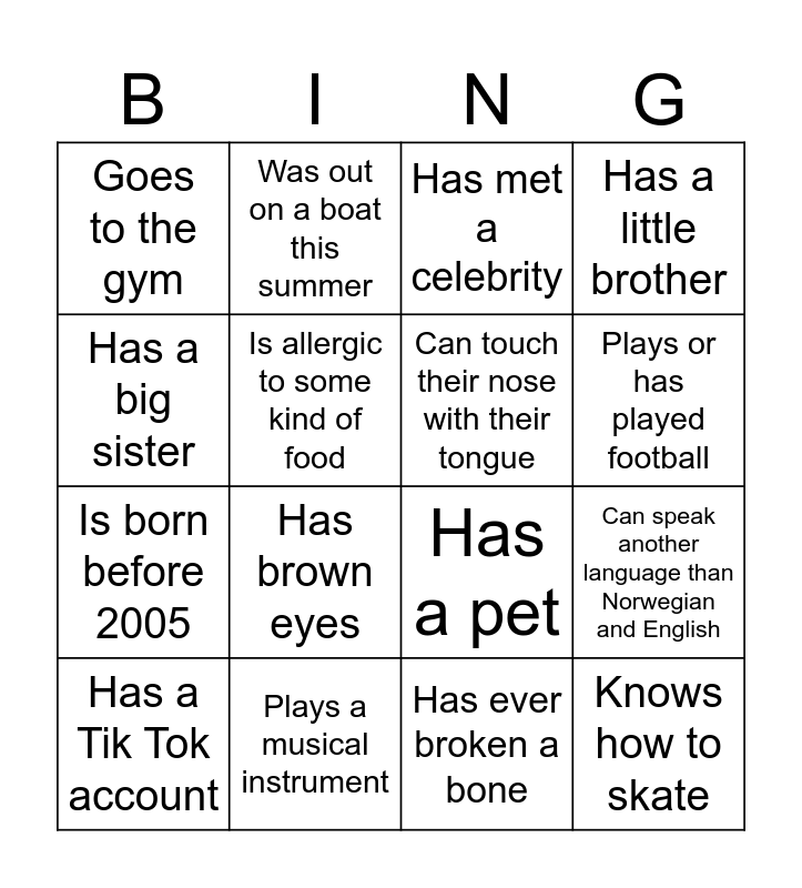 This bingo card has 16 words: Plays a musical instrument, Can speak another language than Norwegian and English, Has met a celebrity, Goes to the gym, Is born before 2005, Was out on a boat this summer, Has a pet, Has ever broken a bone, Has a big sister, Is allergic to some kind of food, Has a Tik Tok account, Has a little brother, Has brown eyes, Plays or has played football, Can touch their nose with their tongue and Knows how to skate.