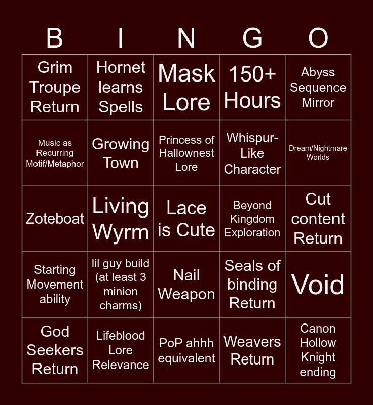 This bingo card has a free space and 24 words: lil guy build (at least 3 minion charms), Lifeblood Lore Relevance, Princess of Hallownest Lore, God Seekers Return, Abyss Sequence Mirror, Grim Troupe Return, Music as Recurring Motif/Metaphor, Hornet learns Spells, Beyond Kingdom Exploration, Nail Weapon, Whispur-Like Character, Zoteboat, Seals of binding Return, Void, Growing Town, Weavers Return, Cut content Return, Mask Lore, Dream/Nightmare Worlds, Living Wyrm, Canon Hollow Knight ending, Starting Movement ability, 150+ Hours and PoP ahhh equivalent.