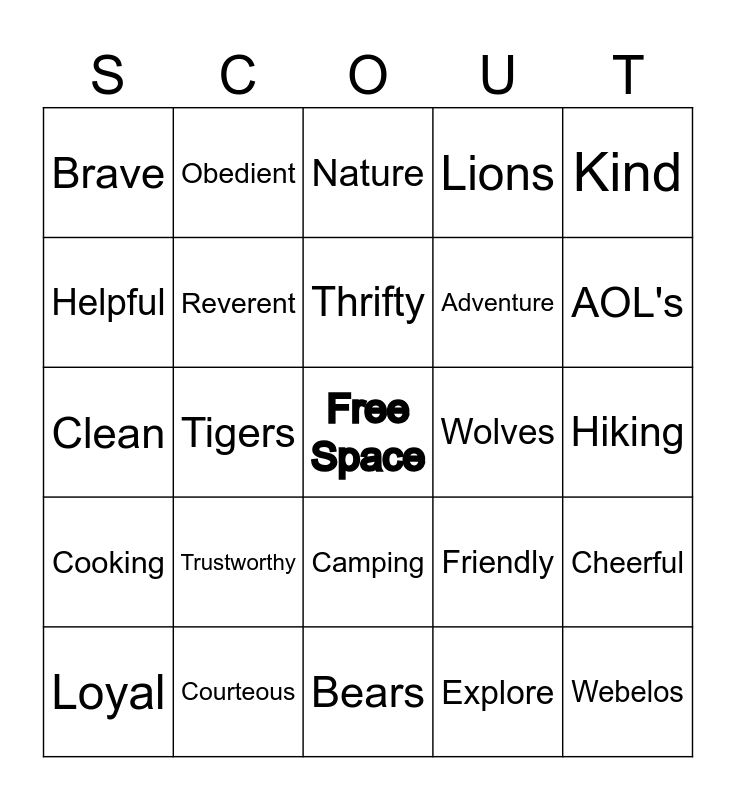 This bingo card has a free space and 24 words: Trustworthy, Courteous, Thrifty, Loyal, Kind, Brave, Helpful, Obedient, Wolves, Camping, Adventure, Clean, Friendly, Cheerful, Reverent, Explore, Hiking, Nature, AOL's, Tigers, Webelos, Cooking, Lions and Bears.