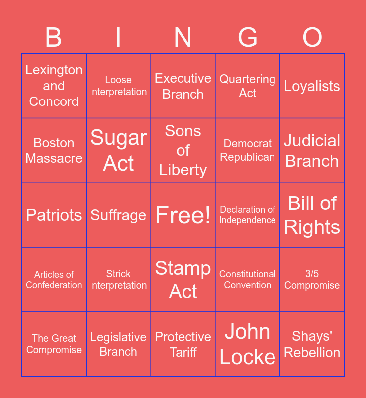 This bingo card has a free space and 35 words: Salutary neglect, French and Indian War, Proclamation Line of 1763, Sugar Act, Stamp Act, Quartering Act, Boston Massacre, Boston Tea Party, Sons of Liberty, Daughters of Liberty, Patriots, Loyalists, George Washington, Thomas Paine, Lexington and Concord, Declaration of Independence, John Locke, Suffrage, Articles of Confederation, Shays' Rebellion, Constitutional Convention, The Great Compromise, 3/5 Compromise, Legislative Branch, Executive Branch, Judicial Branch, Checks and Balances, Federalists, Democrat Republican, Bill of Rights, Alexander Hamilton, Protective Tariff, Strick interpretation, Loose interpretation and Whiskey Rebellion.
