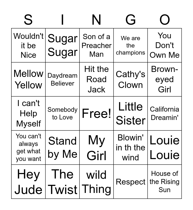 This bingo card has a free space and 29 words: Hey Jude, Have You Ever Seen the Rain, Somebody to Love, What a Wonderful World, Wouldn't it be Nice, Son of a Preacher Man, Daydream Believer, Stand by Me, Little Sister, The Twist, California Dreamin', House of the Rising Sun, wild Thing, Respect, Brown-eyed Girl, I feel Good, My Girl, You can't always get what you want, You Don't Own Me, I can't Help Myself, Blowin' in th the wind, Oh Pretty Woman, Cathy's Clown, Mellow Yellow, We are the champions, Sugar Sugar, Louie Louie, Hit the Road Jack and Wooly Bully.