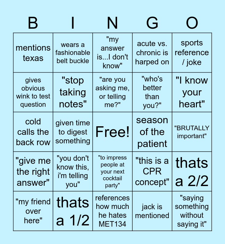 This bingo card has a free space and 24 words: "you don't know this, i'm telling you", thats a 1/2, "are you asking me, or telling me?", "my friend over here", sports reference / joke, mentions texas, gives obvious wink to test question, wears a fashionable belt buckle, season of the patient, "to impress people at your next cocktail party", "who's better than you?", cold calls the back row, "this is a CPR concept", thats a 2/2, "stop taking notes", jack is mentioned, "BRUTALLY important", "my answer is...I don't know", "I know your heart", given time to digest something, "saying something without saying it", "give me the right answer", acute vs. chronic is harped on and references how much he hates MET134.