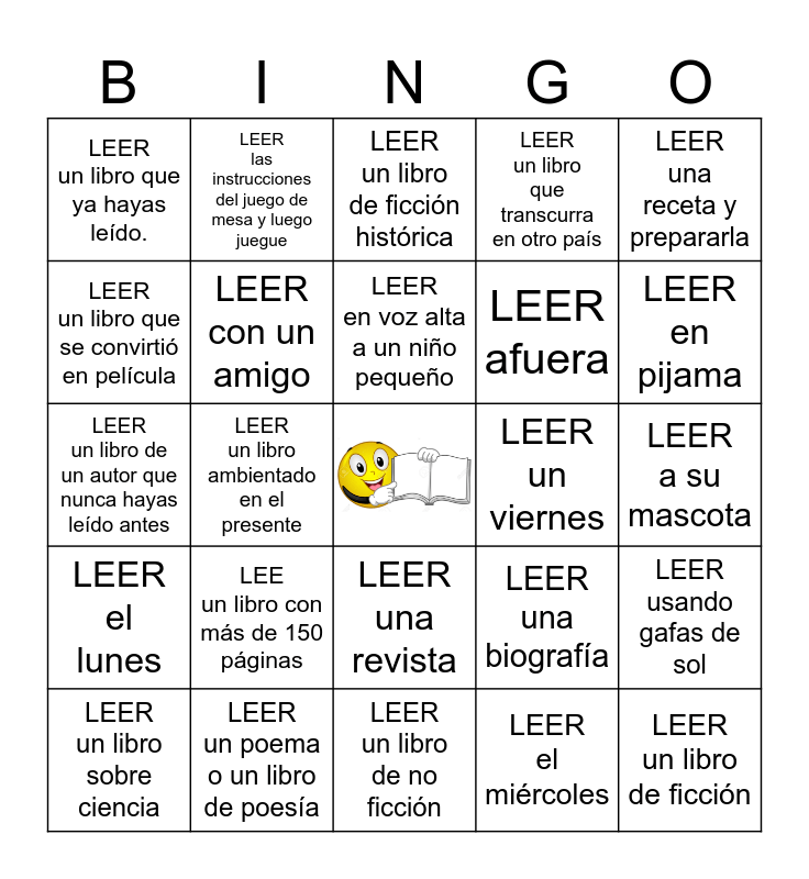 This bingo card has a free space and 24 words: LEE un libro con más de 150 páginas, LEER un poema o un libro de poesía, LEER en voz alta a un niño pequeño, LEER un libro sobre ciencia, LEER una receta y prepararla, LEER un libro que ya hayas leído., LEER un libro que se convirtió en película, LEER las instrucciones del juego de mesa y luego juegue, LEER un viernes, LEER una revista, LEER afuera, LEER un libro de un autor que nunca hayas leído antes, LEER una biografía, LEER usando gafas de sol, LEER con un amigo, LEER el miércoles, LEER a su mascota, LEER un libro de ficción histórica, LEER en pijama, LEER un libro ambientado en el presente, LEER un libro de ficción, LEER el lunes, LEER un libro que transcurra en otro país and LEER un libro de no ficción.
