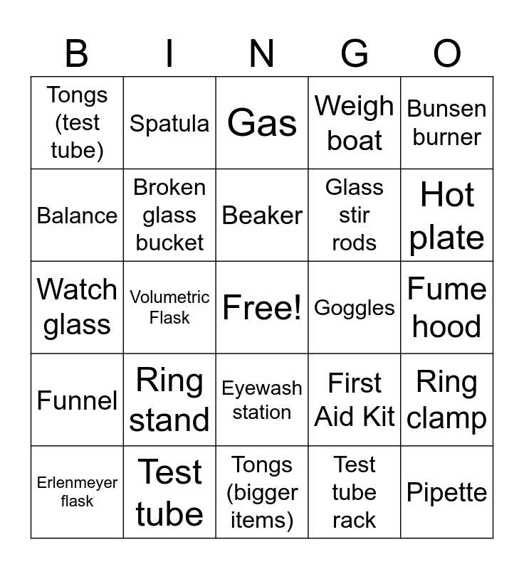 This bingo card has a free space and 24 words: Ring stand, Test tube, Beaker, Erlenmeyer flask, Bunsen burner, Tongs (test tube), Balance, Spatula, Goggles, Eyewash station, Glass stir rods, Watch glass, First Aid Kit, Ring clamp, Broken glass bucket, Test tube rack, Fume hood, Gas, Hot plate, Volumetric Flask, Pipette, Funnel, Weigh boat and Tongs (bigger items).