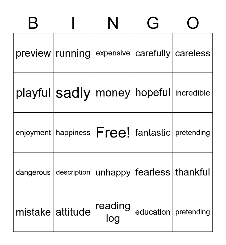 This bingo card has a free space and 24 words: description, attitude, money, mistake, careless, preview, playful, running, fantastic, unhappy, hopeful, enjoyment, fearless, thankful, sadly, education, pretending, expensive, incredible, happiness, pretending, dangerous, carefully and reading log.