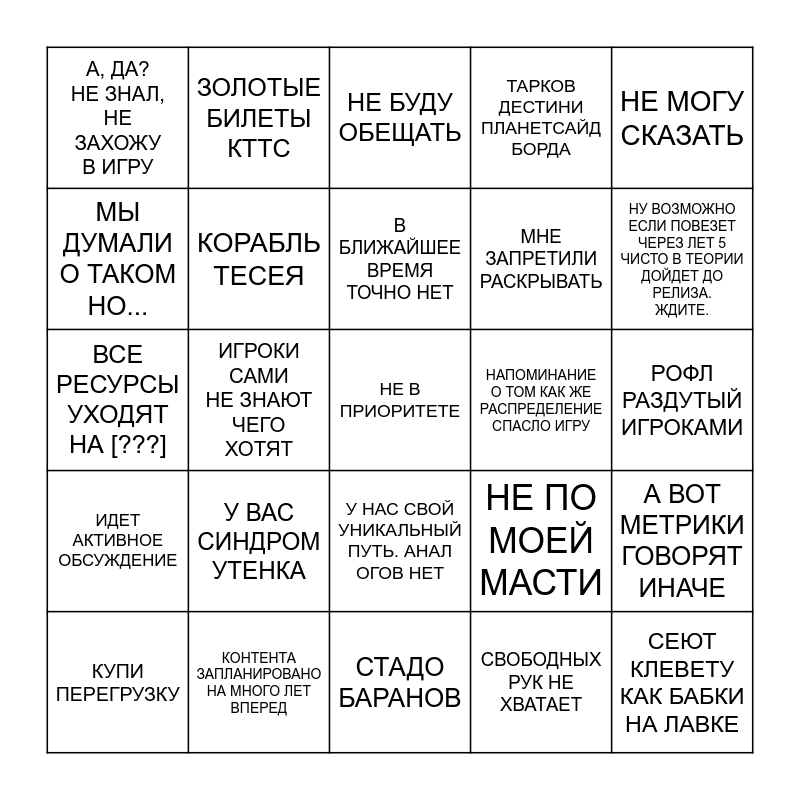 This bingo card has a free space and 24 words: У ВАС СИНДРОМ УТЕНКА, КОНТЕНТА ЗАПЛАНИРОВАНО НА МНОГО ЛЕТ ВПЕРЕД, В БЛИЖАЙШЕЕ ВРЕМЯ ТОЧНО НЕТ, КУПИ ПЕРЕГРУЗКУ, НЕ МОГУ СКАЗАТЬ, А, ДА? НЕ ЗНАЛ, НЕ ЗАХОЖУ В ИГРУ, МЫ ДУМАЛИ О ТАКОМ НО..., ЗОЛОТЫЕ БИЛЕТЫ КТТС, НАПОМИНАНИЕ О ТОМ КАК ЖЕ РАСПРЕДЕЛЕНИЕ СПАСЛО ИГРУ, У НАС СВОЙ УНИКАЛЬНЫЙ ПУТЬ. АНАЛ ОГОВ НЕТ, МНЕ ЗАПРЕТИЛИ РАСКРЫВАТЬ, ВСЕ РЕСУРСЫ УХОДЯТ НА [???], НЕ ПО МОЕЙ МАСТИ, А ВОТ МЕТРИКИ ГОВОРЯТ ИНАЧЕ, КОРАБЛЬ ТЕСЕЯ, СВОБОДНЫХ РУК НЕ ХВАТАЕТ, РОФЛ РАЗДУТЫЙ ИГРОКАМИ, НЕ БУДУ ОБЕЩАТЬ, НУ ВОЗМОЖНО ЕСЛИ ПОВЕЗЕТ ЧЕРЕЗ ЛЕТ 5 ЧИСТО В ТЕОРИИ ДОЙДЕТ ДО РЕЛИЗА. ЖДИТЕ., ИГРОКИ САМИ НЕ ЗНАЮТ ЧЕГО ХОТЯТ, СЕЮТ КЛЕВЕТУ КАК БАБКИ НА ЛАВКЕ, ИДЕТ АКТИВНОЕ ОБСУЖДЕНИЕ, ТАРКОВ ДЕСТИНИ ПЛАНЕТСАЙД БОРДА and СТАДО БАРАНОВ.