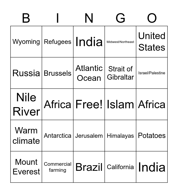 This bingo card has a free space and 50 words: China, India, Spain, Brazil, Antarctica, Tigris and Euphrates, Refugees, Indo-European, Russia, Vatican City, Brussels, Midwest/Northeast, Potatoes, Himalayas, Stage 4, Paris, Atlantic Ocean, Islam, English, United States, Africa, California, Wyoming, Strait of Gibraltar, Asia, Nepal, Israel/Palestine, Mecca/Arabian Peninsula, India, Jerusalem, Britain, Spain, France, Subsistence farming, Commercial farming, Berlin Wall, New Orleans, California, Alaska, Africa, Australia, Italy, Canada, Bhutan, Mount Everest, Nile River, Pacific Ocean, Arctic Ocean, Warm climate and Lack of jobs/economic reasons.