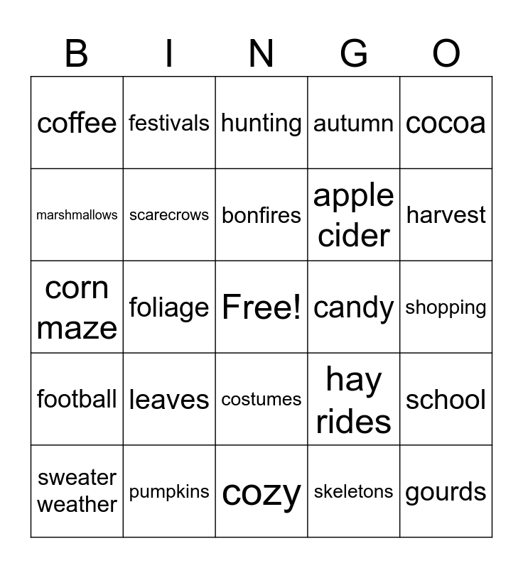 This bingo card has a free space and 24 words: leaves, pumpkins, bonfires, sweater weather, cocoa, coffee, marshmallows, festivals, candy, costumes, apple cider, corn maze, hay rides, school, scarecrows, skeletons, shopping, hunting, harvest, foliage, gourds, football, autumn and cozy.