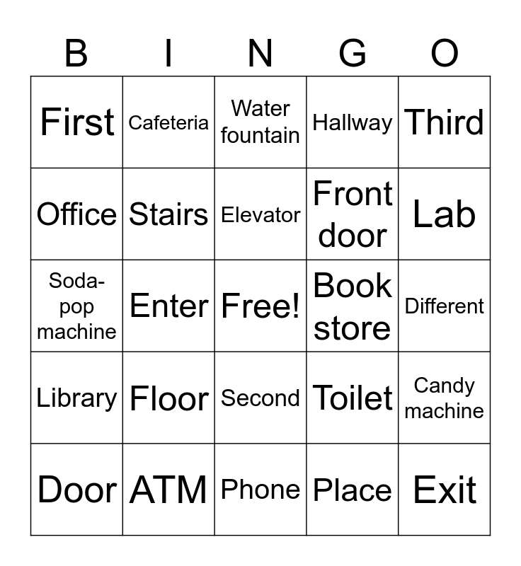 This bingo card has a free space and 27 words: Toilet, Classroom, Front door, Phone, Office, Water fountain, Cafeteria, Library, Book store, Candy machine, Soda-pop machine, Hallway, Door, ATM, Lab, Lobby, Stairs, Elevator, Floor, First, Different, Place, Enter, Exit, Second, Third and Building.