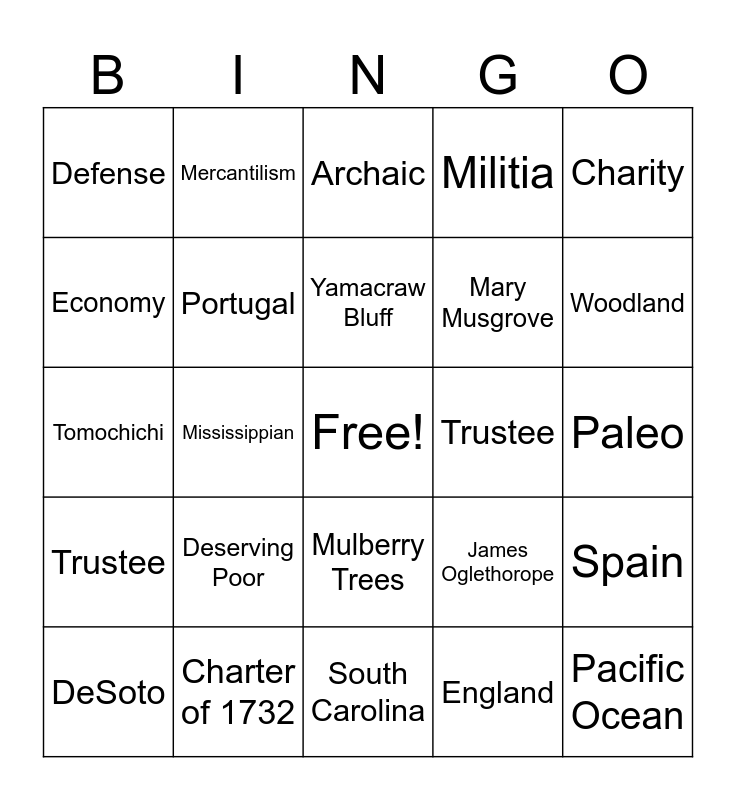 This bingo card has a free space and 24 words: Deserving Poor, Charter of 1732, Yamacraw Bluff, DeSoto, Charity, Defense, Economy, Mercantilism, Trustee, Mulberry Trees, Mary Musgrove, Tomochichi, James Oglethorope, Spain, Portugal, England, Paleo, Archaic, Woodland, Mississippian, Pacific Ocean, Trustee, Militia and South Carolina.