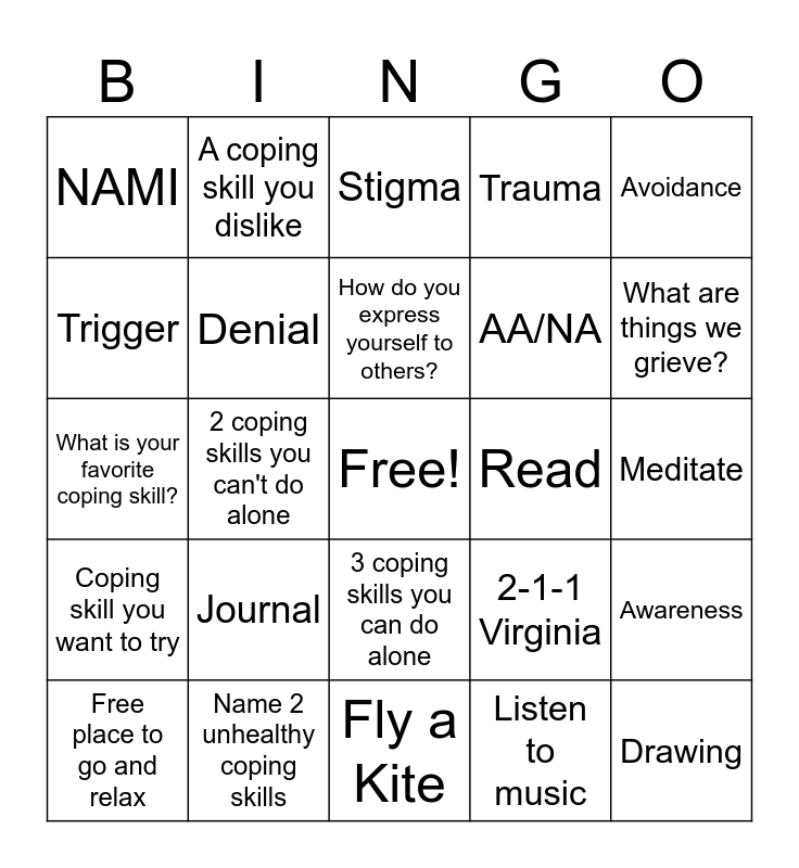 This bingo card has a free space and 24 words: Journal, Name 2 unhealthy coping skills, How do you express yourself to others?, Free place to go and relax, Avoidance, NAMI, Trigger, A coping skill you dislike, Read, 3 coping skills you can do alone, AA/NA, What is your favorite coping skill?, 2-1-1 Virginia, Awareness, Denial, Listen to music, Meditate, Stigma, What are things we grieve?, 2 coping skills you can't do alone, Drawing, Coping skill you want to try, Trauma and Fly a Kite.