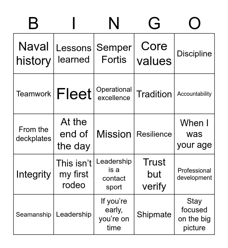 This bingo card has 61 words: Free!, Leadership, Honor, Integrity, Shipmate, Commitment, Fleet, Midshipman, Tradition, Service, Core values, Warfare, Teamwork, Mentorship, Courage, Naval history, Mission, Discipline, Chain of command, Operational excellence, Resilience, Semper Fortis, Seamanship, Professional development, Strategic, Respect, Heritage, Excellence, Accountability, Preparedness, Sacrifice, Back when I was a mid, Out in the fleet, Let me tell you a sea story, Lessons learned, Eyes in the boat, Failure is not an option, At the end of the day, Boots on the ground, From the deckplates, Ship, shipmate, self, This isn’t my first rodeo, When I was your age, I still remember Plebe Summer, Trust but verify, Stay in your lane, That’s above your pay grade, Front leaning rest position, Midshipman are the future of the Navy, Leadership is a contact sport, If you’re early, you’re on time, Don’t reinvent the wheel, Bloom where you’re planted, Lead from the front, Know your people, Take ownership, Mission first, people always, Set the standard, Make every day count, Stay focused on the big picture and You’re writing your own FITREP.