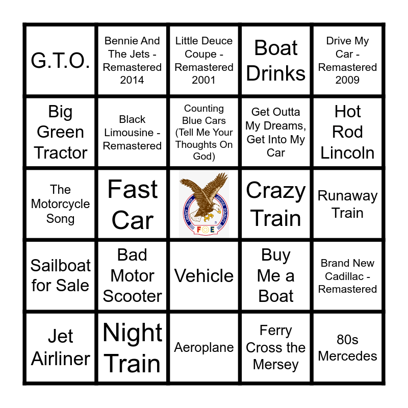 This bingo card has a free space and 51 words: 409, 80s Mercedes, '92 Subaru, Aeroplane, Bad Motor Scooter, Banana Boat (Day-O), Bennie And The Jets - Remastered 2014, Bicycle Race - Remastered, Big Green Tractor, Big Yellow Taxi, Black Limousine - Remastered, Boat Drinks, Brand New Cadillac - Remastered, Buy Me a Boat, Cars, Chevy Van, Counting Blue Cars (Tell Me Your Thoughts On God), Crazy Train, Downtown Train, Drive My Car - Remastered 2009, Fast Car, Ferry Cross the Mersey, G.T.O., Get Outta My Dreams, Get Into My Car, Harleys In Hawaii, Hey Little Cobra, Hot Rod Lincoln, I'm In Love With My Car - Remastered 2011, Jet Airliner, Little Deuce Coupe - Remastered 2001, Little Red Corvette, Long Train Runnin', Magic Bus - Original Stereo Version, Midnight Train to Georgia, Mustang Sally, Night Train, Pink Cadillac - Single B-Side - 1984, Rock N Roll Train, Rock the Boat, Rollin' In My 5.0 - Live, Runaway Train, Sailboat for Sale, Scooter Blues, Sidewalk Surfin', Slick Black Cadillac, Taxi, The Motorcycle Song, Train Kept a Rollin', Train, Train, Vehicle and Yellow Submarine.
