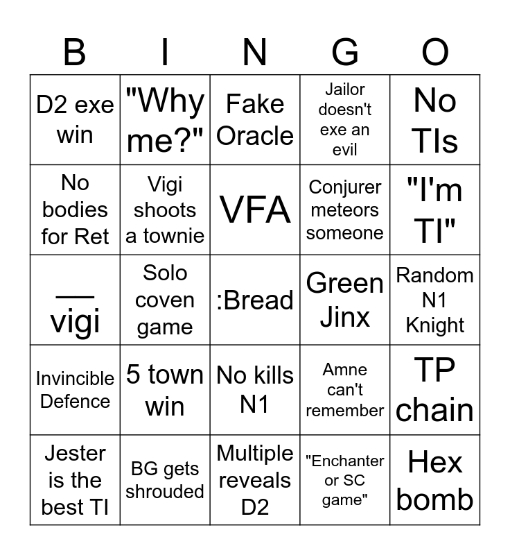 This bingo card has a free space and 24 words: 5 town win, BG gets shrouded, VFA, Jester is the best TI, No TIs, D2 exe win, No bodies for Ret, "Why me?", Green Jinx, No kills N1, Conjurer meteors someone, __ vigi, Amne can't remember, TP chain, Vigi shoots a townie, "Enchanter or SC game", Random N1 Knight, Fake Oracle, "I'm TI", Solo coven game, Hex bomb, Invincible Defence, Jailor doesn't exe an evil and Multiple reveals D2.