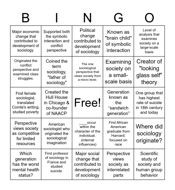 This bingo card has a free space and 24 words: American sociologist who originated the sociological imagination, First professor of sociology in France and studied suicide., The one sociological perspective that views society from a micro level., Which generation has the worst mental health status?, Level of analysis that examines society on a large-scale basis, Major economic change that contributed to development of sociology., Originated the conflict perspective and examined class struggles., Supported both the symbolic interaction and conflict perspective, Generation known as the “sandwich generation”, ____occur within the character of the individual. (internal influences), Examining society on a small-scale basis, First female sociologist, translated Comte's writing; studied poverty, First African American graduate from Harvard; focused on race, Where did sociology originate?, Coined the term sociology, "father of sociology", Perspective views society as interrelated parts, One group that has highest rate of suicide in 18th century and today, Political change contributed to development of sociology, Creator of "looking glass self" theory, Created the Hull House in Chicago & co-founder of NAACP, Scientific study of society and human group behavior, Perspective views society as competitive for limited resources, Known as "brain child" of symbolic interaction and Major social change that contributed to development of sociology.