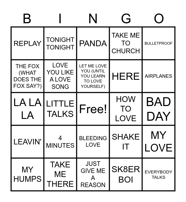 This bingo card has a free space and 75 words: ZOMBIE, REMEMBER THE NAME, PANDA, NYAN CAT, BLACK AND YELLOW, LIGHTS, CHANDELIER, CHEERLEADER, ALEJANDRO, RUDE, HARLEM SHAKE, FORGET YOU, LET ME LOVE YOU (UNTIL YOU LEARN TO LOVE YOURSELF), THE FOX (WHAT DOES THE FOX SAY?), DRIVE BY, LITTLE TALKS, ANIMAL, EVERYBODY TALKS, THE SHOW GOES ON, BULLETPROOF, SWEATER WEATHER, LA LA LA, LOVE YOU LIKE A LOVE SONG, TONIGHT TONIGHT, TAKE ME TO CHURCH, IM AN ALBATRAOZ, I WANNA GO, HELLO, SHOWER, USE SOMEBODY, #SELFIE, AIN'T IT FUN, THRIFT SHOP, SHAKE IT, AIRPLANES, HERE, MY FIRST KISS, SAIL, BAD DAY, SK8ER BOI, STRONGER (WHAT DOESN'T KILL YOU), COMPLICATED, CRUSH, WOMANIZER, DAMAGED, THAT SHOULD BE ME, MY HUMPS, REPLAY, DIRTY LITTLE SECRET, MOVE ALONG, PARADISE, BLEEDING LOVE, BEAUTIFUL SOUL, 23, TOO LITTLE, TOO LATE, BREAKEVEN, CRY ME A RIVER, THIS LOVE, BEAUTIFUL GIRLS, ROUND & ROUND, 4 MINUTES, JULIET, TOUCH MY BODY, JUST THE GIRL, UNFAITHFUL, HOW TO LOVE, REALIZE, WAKE ME UP WHEN SEPTEMBER ENDS, MISERY BUSINESS, MY LOVE, LEAVIN', TAKE ME THERE, SCOTTY DOESN'T KNOW, JUST GIVE ME A REASON and PARTY LIKE A ROCK STAR.