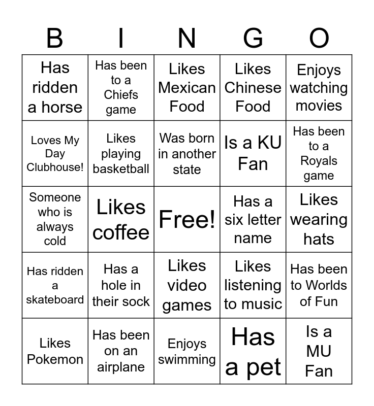 This bingo card has a free space and 24 words: Likes Pokemon, Has a hole in their sock, Was born in another state, Has a pet, Enjoys watching movies, Has ridden a horse, Has been to a Chiefs game, Likes Mexican Food, Has a six letter name, Likes wearing hats, Someone who is always cold, Likes playing basketball, Likes listening to music, Has been to Worlds of Fun, Loves My Day Clubhouse!, Has been on an airplane, Enjoys swimming, Likes Chinese Food, Has been to a Royals game, Has ridden a skateboard, Likes coffee, Likes video games, Is a KU Fan and Is a MU Fan.