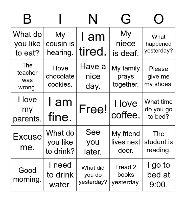 This bingo card has a free space and 29 words: Good morning., How are you?, I am fine., My name is ...., What do you like to eat?, I am tired., I love chocolate cookies., What do you like to drink?, I love coffee., I need to drink water., What time do you go to bed?, I go to bed at 9:00., What did you do yesterday?, I read 2 books yesterday., Please give me my shoes., Thank you!, See you later., Excuse me., What happened yesterday?, I love my parents., My friend lives next door., The children drink milk., My family prays together., The teacher was wrong., My niece is deaf., My cousin is hearing., The student is reading., Have a nice day. and I like my class..