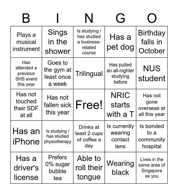 This bingo card has a free space and 24 words: Is studying / has studied physiotherapy, Prefers 0% sugar bubble tea, Trilingual, Has a driver's license, Birthday falls in October, Plays a musical instrument, Has attended a previous SHS event this year, Sings in the shower, NRIC starts with a T, Drinks at least 2 cups of coffee a day, Has pulled an all-nighter studying before, Has not touched their SDF at all, Is currently wearing contact lens, Is bonded to a community hospital, Goes to the gym at least once a week, Wearing black, Has not gone overseas at all this year, Is studying / has studied a business-related course, NUS student, Has not fallen sick this year, Lives in the same area of Singapore as you, Has an iPhone, Has a pet dog and Able to roll their tongue.