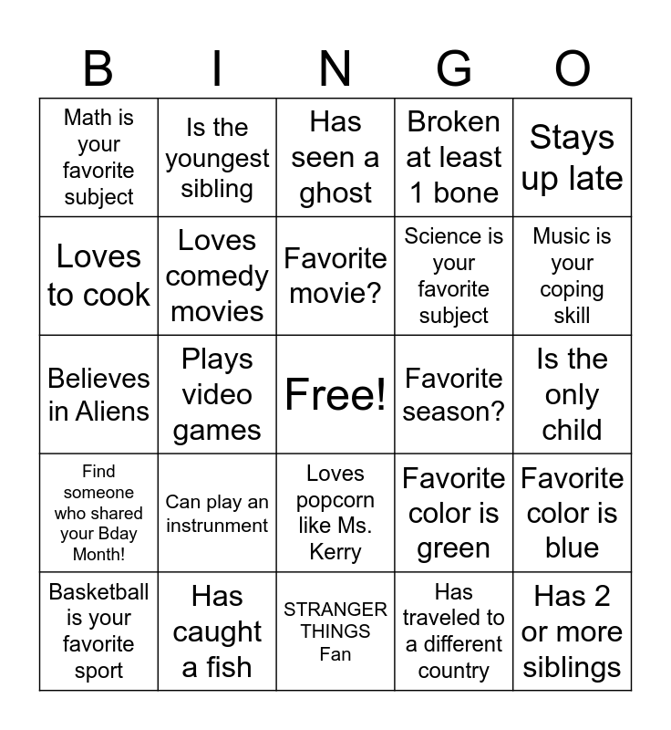 This bingo card has a free space and 49 words: Has a Pet, Has 2 or more siblings, Knows a knock knock Joke!, STRANGER THINGS Fan, Can play an instrunment, Was born in a different state/country, Is the youngest sibling, Is the oldest sibling, Loves to cook, Loves Horror movies, Loves comedy movies, Broken at least 1 bone, Favorite color is blue, Favorite color is green, Left handed, Speaks more than 2 languages, Favorite movie?, Favorite season?, Likes to wake up early, Stays up late, Plays video games, Has traveled to a different country, Math is your favorite subject, Science is your favorite subject, Loves METRO PREP!!, Music is your coping skill, Basketball is your favorite sport, Football is your favorite sport, Loves popcorn like Ms. Kerry, Find someone who shared your Bday Month!, Afraid of spiders, Afraid of heights, Likes spicy food, Agrees that Metro Prep is the best!! :-), Has caught a fish, Has been to a concert? If so, who?, Has met a celebrity, Has twins in their family, Is the only child, Has binge watched a show. If so, which one?, Is named after someone famous?, Has has stitches, Been to a haunted house, Has sky dived, Believes in Aliens, Has seen a ghost, Believes in mermaids, Has a favorite pixar movie and Mufasa or Scar.