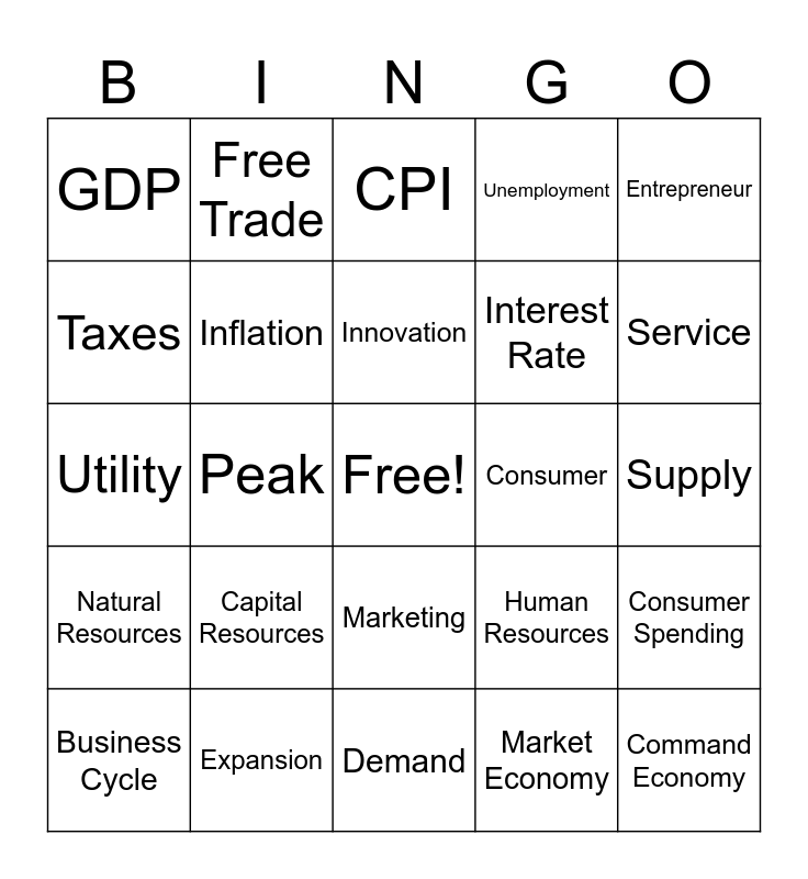 This bingo card has a free space and 30 words: Expansion, Recession, Peak, Trough, GDP, CPI, Inflation, Marketing, Consumer, Demand, Supply, Command Economy, Market Economy, Mixed Economy, Service, Good, Human Resources, Natural Resources, Capital Resources, Entrepreneur, Utility, International Trade, Free Trade, Interest Rate, Taxes, Unemployment, Consumer Spending, Business Cycle, Innovation and Promotion.