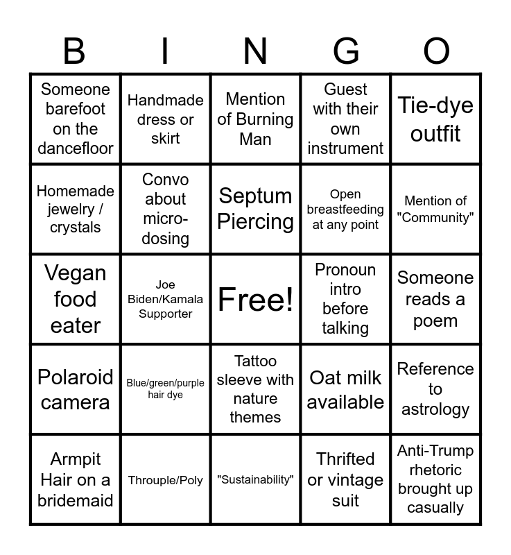 This bingo card has a free space and 24 words: Blue/green/purple hair dye, Throuple/Poly, Septum Piercing, Armpit Hair on a bridemaid, Tie-dye outfit, Someone barefoot on the dancefloor, Homemade jewelry / crystals, Handmade dress or skirt, Pronoun intro before talking, Tattoo sleeve with nature themes, Open breastfeeding at any point, Vegan food eater, Oat milk available, Reference to astrology, Convo about micro-dosing, Thrifted or vintage suit, Someone reads a poem, Mention of Burning Man, Mention of "Community", Joe Biden/Kamala Supporter, Anti-Trump rhetoric brought up casually, Polaroid camera, Guest with their own instrument and "Sustainability".