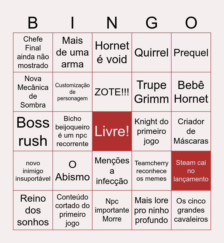 This bingo card has a free space and 24 words: O Abismo, Conteúdo cortado do primeiro jogo, ZOTE!!!, Reino dos sonhos, Prequel, Chefe Final ainda não mostrado, Nova Mecânica de Sombra, Mais de uma arma, Knight do primeiro jogo, Menções a infecção, Trupe Grimm, Boss rush, Teamcherry reconhece os memes, Steam cai no lançamento, Customização de personagem, Mais lore pro ninho profundo, Criador de Máscaras, Hornet é void, Bebê Hornet, Bicho beijoqueiro é um npc recorrente, Os cinco grandes cavaleiros, novo inimigo insuportável, Quirrel and Npc importante Morre.