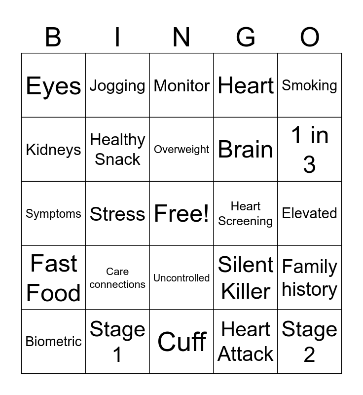 This bingo card has a free space and 32 words: Heart Attack, Checkup, Stress, Walking, Fast Food, Healthy Snack, Smoking, Family history, Jogging, Sleep, Overweight, Monitor, Hypertension, Screening, Heart Screening, Community Health Worker (CHW), Biometric, Symptoms, Uncontrolled, Care connections, Silent Killer, Normal, Elevated, Stage 1, Stage 2, Heart, Brain, Kidneys, Eyes, Cuff, Recap and 1 in 3.