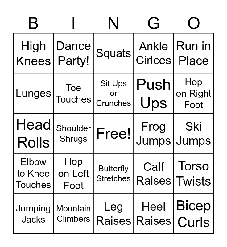 This bingo card has a free space and 24 words: Hop on Left Foot, Mountain Climbers, Sit Ups or Crunches, Jumping Jacks, Run in Place, High Knees, Lunges, Dance Party!, Frog Jumps, Butterfly Stretches, Push Ups, Head Rolls, Calf Raises, Torso Twists, Toe Touches, Heel Raises, Ski Jumps, Squats, Hop on Right Foot, Shoulder Shrugs, Bicep Curls, Elbow to Knee Touches, Ankle Cirlces and Leg Raises.