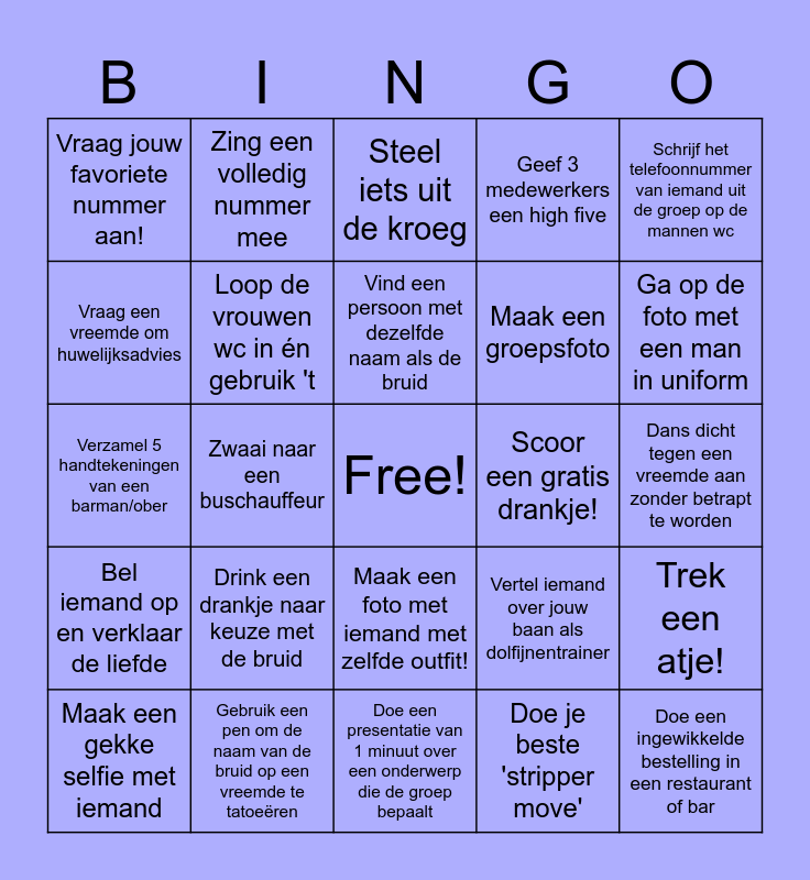 This bingo card has a free space and 24 words: Drink een drankje naar keuze met de bruid, Gebruik een pen om de naam van de bruid op een vreemde te tatoeëren, Vind een persoon met dezelfde naam als de bruid, Maak een gekke selfie met iemand, Schrijf het telefoonnummer van iemand uit de groep op de mannen wc, Vraag jouw favoriete nummer aan!, Vraag een vreemde om huwelijksadvies, Zing een volledig nummer mee, Scoor een gratis drankje!, Maak een foto met iemand met zelfde outfit!, Maak een groepsfoto, Verzamel 5 handtekeningen van een barman/ober, Vertel iemand over jouw baan als dolfijnentrainer, Trek een atje!, Loop de vrouwen wc in én gebruik 't, Doe je beste 'stripper move', Dans dicht tegen een vreemde aan zonder betrapt te worden, Steel iets uit de kroeg, Ga op de foto met een man in uniform, Zwaai naar een buschauffeur, Doe een ingewikkelde bestelling in een restaurant of bar, Bel iemand op en verklaar de liefde, Geef 3 medewerkers een high five and Doe een presentatie van 1 minuut over een onderwerp die de groep bepaalt.