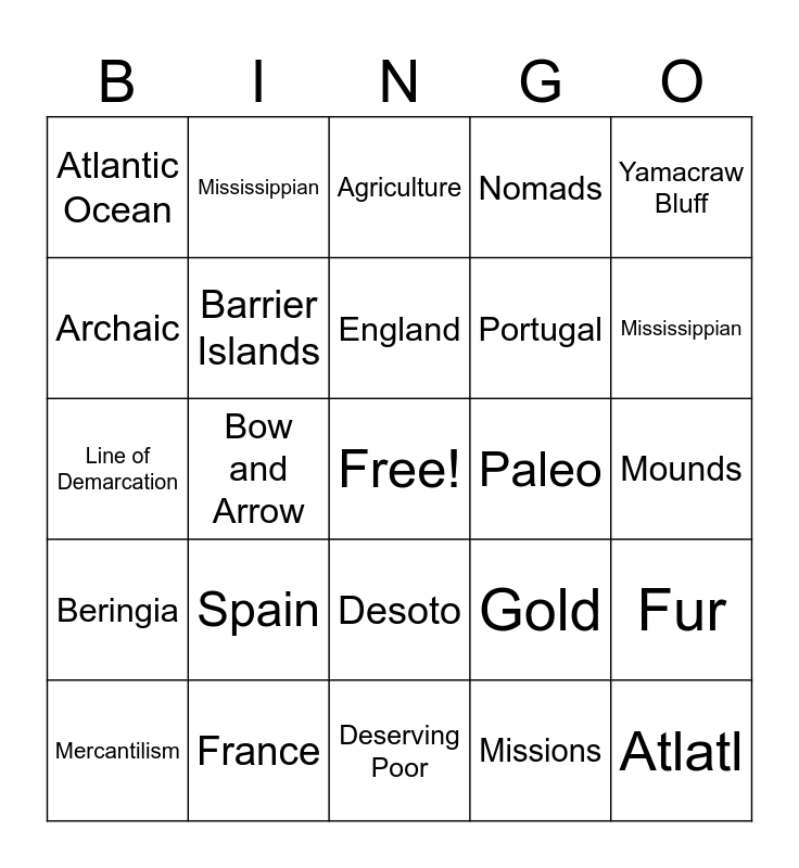This bingo card has a free space and 24 words: Spain, France, England, Mercantilism, Yamacraw Bluff, Atlantic Ocean, Archaic, Mississippian, Paleo, Desoto, Portugal, Line of Demarcation, Gold, Fur, Barrier Islands, Missions, Mounds, Agriculture, Mississippian, Bow and Arrow, Atlatl, Beringia, Nomads and Deserving Poor.