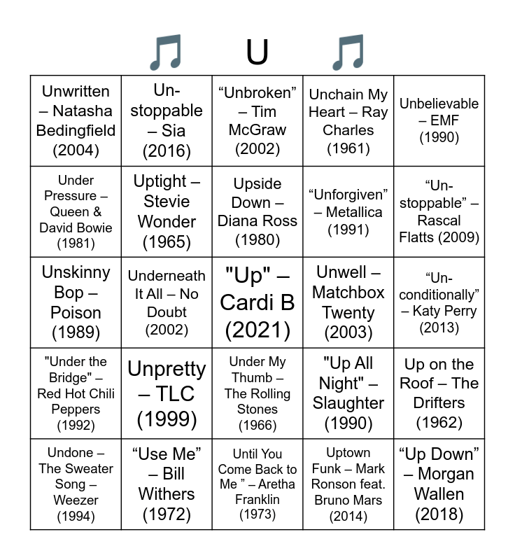 This bingo card has 35 words: Unchained Melody – The Righteous Brothers (1965), Under the Boardwalk – The Drifters (1964), Unforgettable – Nat King Cole (1951), Uptight – Stevie Wonder (1965), Under My Thumb – The Rolling Stones (1966), Unchain My Heart – Ray Charles (1961), Under Pressure – Queen & David Bowie (1981), Undercover Angel – Alan O’Day (1977), Upside Down – Diana Ross (1980), Urgent – Foreigner (1981), Unskinny Bop – Poison (1989), Unbelievable – EMF (1990), U Can’t Touch This – MC Hammer (1990), Umbrella – Rihanna feat. Jay-Z (2007), Unwritten – Natasha Bedingfield (2004), Unwell – Matchbox Twenty (2003), Uptown Funk – Mark Ronson feat. Bruno Mars (2014), Underneath It All – No Doubt (2002), "Under the Bridge" – Red Hot Chili Peppers (1992), "Up" – Cardi B (2021), "Up All Night" – Slaughter (1990), Undone – The Sweater Song – Weezer (1994), Up on the Roof – The Drifters (1962), “Use Me” – Bill Withers (1972), “Unbroken” – Tim McGraw (2002), “Un-stoppable” – Rascal Flatts (2009), “Up Down” – Morgan Wallen (2018), “Unfaithful” – Rihanna (2006), “Unforgiven” – Metallica (1991), “Un-conditionally” – Katy Perry (2013), Underdog Cartoon Theme, Until You Come Back to Me ” – Aretha Franklin (1973), Unpretty – TLC (1999), Un-stoppable – Sia (2016) and Uncle Albert/Admiral Halsey– Paul McCartney (1971).