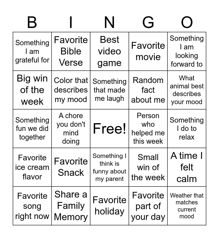 This bingo card has a free space and 24 words: Favorite Snack, Share a Family Memory, Something that made me laugh, Favorite song right now, Something I am looking forward to, Something I am grateful for, Big win of the week, Favorite Bible Verse, Person who helped me this week, Something I think is funny about my parent, Random fact about me, Something fun we did together, Small win of the week, A time I felt calm, Color that describes my mood, Favorite part of your day, Something I do to relax, Best video game, What animal best describes your mood, A chore you don't mind doing, Weather that matches current mood, Favorite ice cream flavor, Favorite movie and Favorite holiday.