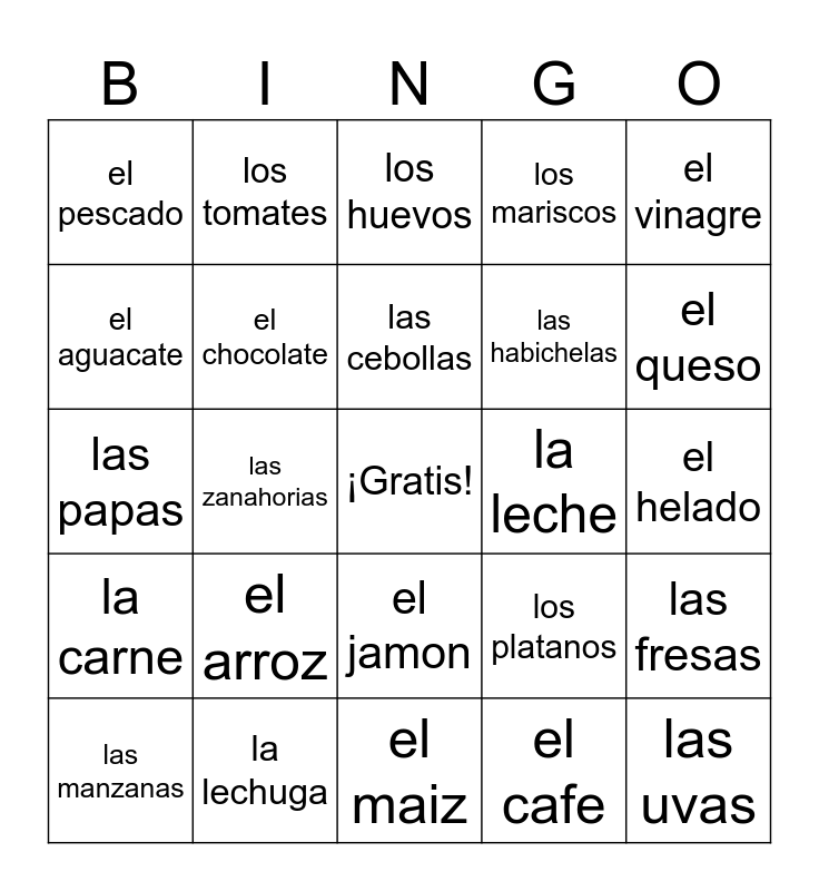 This bingo card has a free space and 24 words: el arroz, la lechuga, las cebollas, las manzanas, el vinagre, el pescado, el aguacate, los tomates, la leche, el jamon, las habichelas, las papas, los platanos, las fresas, el chocolate, el cafe, el helado, los huevos, el queso, las zanahorias, las uvas, la carne, los mariscos and el maiz.