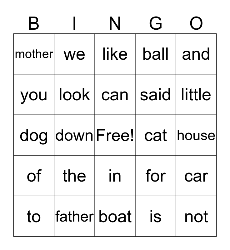 This bingo card has a free space and 24 words: the, father, can, to, and, mother, you, we, cat, in, said, dog, for, car, look, is, house, like, little, down, not, of, ball and boat.