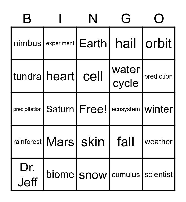 This bingo card has a free space and 24 words: Mars, biome, cell, Dr. Jeff, orbit, nimbus, tundra, experiment, ecosystem, skin, water cycle, precipitation, fall, weather, heart, cumulus, winter, Earth, prediction, Saturn, scientist, rainforest, hail and snow.
