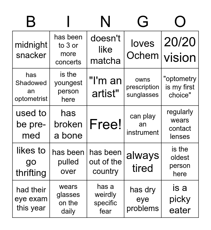 This bingo card has a free space and 24 words: has been pulled over, wears glasses on the daily, "I'm an artist", had their eye exam this year, 20/20 vision, midnight snacker, has Shadowed an optometrist, has been to 3 or more concerts, can play an instrument, has been out of the country, owns prescription sunglasses, used to be pre-med, always tired, is the oldest person here, is the youngest person here, has dry eye problems, regularly wears contact lenses, doesn't like matcha, "optometry is my first choice", has broken a bone, is a picky eater, likes to go thrifting, loves Ochem and has a weirdly specific fear.