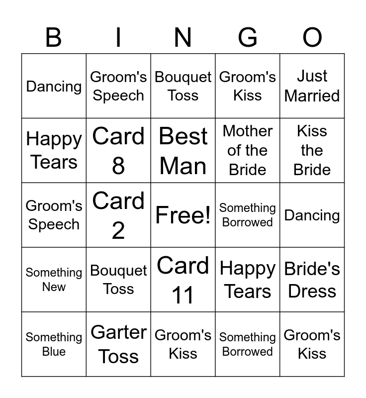 This bingo card has a free space and 522 words: Wedding Bingo Cards, This document contains the words for 20 unique wedding bingo cards. Each card is separated by a horizontal line., Card 1, Bride's Dress, Groom's Speech, Something Blue, First Dance, Best Man, Flower Girl, Bouquet Toss, Wedding Cake, Toasts, Bridesmaid, Happy Tears, Groom's Kiss, Something Borrowed, Mother of the Bride, Wedding Ring, Dancing, Wedding Bells, Cutting the Cake, Maid of Honor, Garter Toss, Father of the Bride, Something New, Kiss the Bride, Just Married, Bride and Groom, Card 2, Groom's Speech, First Dance, Something Borrowed, Happy Tears, Bridesmaid, Something Blue, Wedding Bells, Bride and Groom, Mother of the Bride, Cutting the Cake, Toasts, Wedding Cake, Garter Toss, Father of the Bride, Just Married, Best Man, Something New, Flower Girl, Wedding Ring, Kiss the Bride, Bouquet Toss, Groom's Kiss, Bride's Dress, Maid of Honor, Dancing, Card 3, Something Borrowed, Groom's Kiss, Best Man, Bride's Dress, Bride and Groom, Maid of Honor, Something Blue, Toasts, Just Married, Wedding Bells, Flower Girl, Garter Toss, Happy Tears, Father of the Bride, Groom's Speech, Bouquet Toss, Dancing, Something New, Wedding Ring, Cutting the Cake, First Dance, Bridesmaid, Wedding Cake, Mother of the Bride, Kiss the Bride, Card 4, Bridesmaid, Wedding Ring, First Dance, Something New, Bride and Groom, Garter Toss, Father of the Bride, Something Borrowed, Mother of the Bride, Cutting the Cake, Toasts, Groom's Kiss, Bouquet Toss, Bride's Dress, Best Man, Wedding Cake, Happy Tears, Maid of Honor, Dancing, Flower Girl, Something Blue, Just Married, Kiss the Bride, Wedding Bells, Groom's Speech, Card 5, Wedding Cake, Flower Girl, Maid of Honor, Happy Tears, Bride's Dress, Just Married, Dancing, Bridesmaid, First Dance, Cutting the Cake, Garter Toss, Wedding Ring, Something Borrowed, Groom's Kiss, Father of the Bride, Best Man, Something New, Wedding Bells, Bouquet Toss, Bride and Groom, Toasts, Kiss the Bride, Groom's Speech, Mother of the Bride, Something Blue, Card 6, Bouquet Toss, Garter Toss, Best Man, Maid of Honor, Something New, Groom's Speech, Bride's Dress, Something Blue, First Dance, Wedding Bells, Wedding Cake, Bride and Groom, Toasts, Mother of the Bride, Just Married, Cutting the Cake, Happy Tears, Kiss the Bride, Bridesmaid, Dancing, Something Borrowed, Groom's Kiss, Flower Girl, Wedding Ring, Father of the Bride, Card 7, Wedding Ring, Cutting the Cake, Just Married, Something Blue, Bride's Dress, Something Borrowed, Mother of the Bride, Bouquet Toss, Bridesmaid, Garter Toss, Wedding Bells, Father of the Bride, First Dance, Maid of Honor, Happy Tears, Best Man, Dancing, Groom's Speech, Groom's Kiss, Something New, Toasts, Wedding Cake, Bride and Groom, Kiss the Bride, Flower Girl, Card 8, Cutting the Cake, Something Borrowed, Groom's Speech, Maid of Honor, Something New, Happy Tears, Wedding Ring, Best Man, Garter Toss, First Dance, Bridesmaid, Toasts, Bride's Dress, Wedding Cake, Flower Girl, Kiss the Bride, Mother of the Bride, Groom's Kiss, Something Blue, Bouquet Toss, Dancing, Just Married, Father of the Bride, Wedding Bells, Bride and Groom, Card 9, Toasts, Just Married, Maid of Honor, Groom's Kiss, Flower Girl, Wedding Cake, Bride's Dress, Something Borrowed, Wedding Bells, Something New, Father of the Bride, First Dance, Bridesmaid, Something Blue, Happy Tears, Garter Toss, Cutting the Cake, Best Man, Kiss the Bride, Mother of the Bride, Bouquet Toss, Wedding Ring, Dancing, Groom's Speech, Bride and Groom, Card 10, Wedding Bells, Mother of the Bride, First Dance, Bridesmaid, Happy Tears, Maid of Honor, Just Married, Father of the Bride, Wedding Ring, Garter Toss, Wedding Cake, Groom's Speech, Cutting the Cake, Toasts, Bouquet Toss, Bride's Dress, Something Blue, Something Borrowed, Something New, Groom's Kiss, Best Man, Flower Girl, Bride and Groom, Kiss the Bride, Dancing, Card 11, Maid of Honor, Happy Tears, Dancing, Cutting the Cake, Groom's Speech, Wedding Cake, Something New, Something Blue, Father of the Bride, Best Man, Garter Toss, Just Married, Bouquet Toss, Bride's Dress, Bridesmaid, First Dance, Wedding Bells, Kiss the Bride, Toasts, Wedding Ring, Something Borrowed, Groom's Kiss, Flower Girl, Mother of the Bride, Bride and Groom, Card 12, Groom's Kiss, Bride and Groom, First Dance, Wedding Bells, Happy Tears, Best Man, Bridesmaid, Something New, Dancing, Father of the Bride, Toasts, Groom's Speech, Wedding Cake, Maid of Honor, Bouquet Toss, Just Married, Something Borrowed, Bride's Dress, Garter Toss, Mother of the Bride, Wedding Ring, Flower Girl, Kiss the Bride, Cutting the Cake, Something Blue, Card 13, First Dance, Wedding Ring, Something Blue, Toasts, Happy Tears, Groom's Speech, Bridesmaid, Father of the Bride, Maid of Honor, Wedding Cake, Best Man, Something Borrowed, Bouquet Toss, Bride's Dress, Groom's Kiss, Just Married, Flower Girl, Something New, Bride and Groom, Kiss the Bride, Mother of the Bride, Garter Toss, Dancing, Wedding Bells, Cutting the Cake, Card 14, Mother of the Bride, Just Married, Wedding Ring, Garter Toss, Happy Tears, Groom's Kiss, Bouquet Toss, Bride and Groom, First Dance, Bride's Dress, Something New, Bridesmaid, Something Blue, Toasts, Cutting the Cake, Maid of Honor, Best Man, Wedding Cake, Dancing, Groom's Speech, Flower Girl, Kiss the Bride, Something Borrowed, Wedding Bells, Father of the Bride, Card 15, Something New, Wedding Ring, Kiss the Bride, Something Borrowed, Happy Tears, Bride and Groom, First Dance, Garter Toss, Groom's Kiss, Maid of Honor, Father of the Bride, Best Man, Bridesmaid, Flower Girl, Wedding Cake, Just Married, Bouquet Toss, Dancing, Wedding Bells, Bride's Dress, Cutting the Cake, Toasts, Groom's Speech, Something Blue, Mother of the Bride, Card 16, Flower Girl, Something New, Cutting the Cake, Happy Tears, Something Borrowed, Wedding Cake, Maid of Honor, Best Man, Toasts, Kiss the Bride, Wedding Ring, Dancing, Groom's Speech, Bouquet Tos