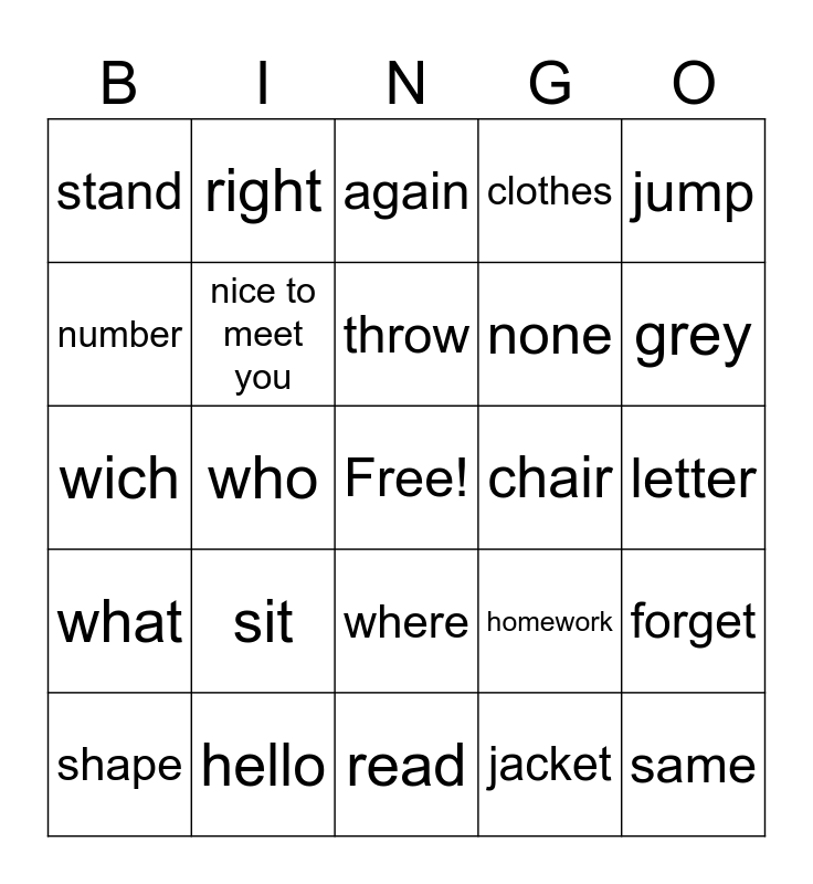 This bingo card has a free space and 24 words: shape, sit, throw, jacket, jump, stand, right, again, chair, letter, wich, nice to meet you, homework, forget, number, hello, read, clothes, grey, what, who, where, none and same.