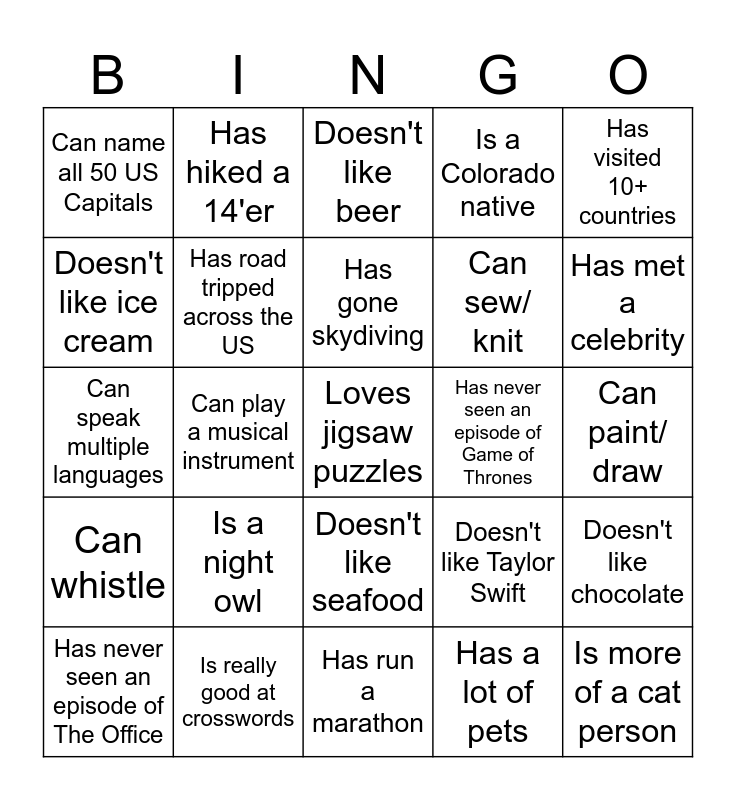 This bingo card has 30 words: Is really good at crosswords, Is left-handed, Can play a musical instrument, Hates vegetables, Can name all 50 US Capitals, Doesn't like beer, Has road tripped across the US, Doesn't like seafood, Has never seen an episode of Game of Thrones, Has run a marathon, Can paint/ draw, Loves jigsaw puzzles, Has a lot of pets, Is more of a cat person, Has met a celebrity, Favorite team is the Denver Broncos, Doesn't like Taylor Swift, Can whistle, Is a night owl, Has visited 10+ countries, Can speak multiple languages, Enjoys gardening, Has hiked a 14'er, Can sew/ knit, Doesn't like ice cream, Is a Colorado native, Doesn't like chocolate, Has never seen an episode of The Office, Has gone skydiving and Has never been skiing/ snowboarding.