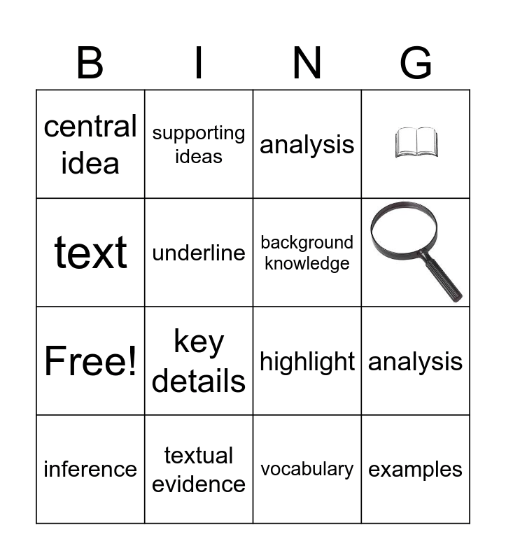 This bingo card has 2 images and 18 words: analysis, evidence, analysis, explicit, inference, text, textual evidence, central idea, Free!, supporting ideas, key details, highlight, underline, examples, background knowledge, investigation, vocabulary and facts.