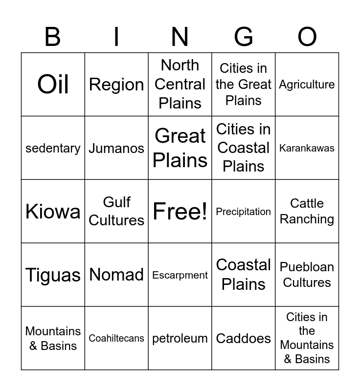 This bingo card has a free space and 34 words: Adobe, Caddoes, Apaches, Climate, Tiguas, Jumanos, Agriculture, Mountains & Basins, Region, Comanches, Great Plains, North Central Plains, Era, Artifact, Precipitation, Karankawas, Coahiltecans, Kiowa, Nomad, Coastal Plains, Escarpment, Shipping, Oil, Cattle Ranching, petroleum, Cities in the Mountains & Basins, Cities in the Great Plains, Cities in North Central Plains, Cities in Coastal Plains, sedentary, Southeastern Cultures, Gulf Cultures, Puebloan Cultures and Plains Cultures.