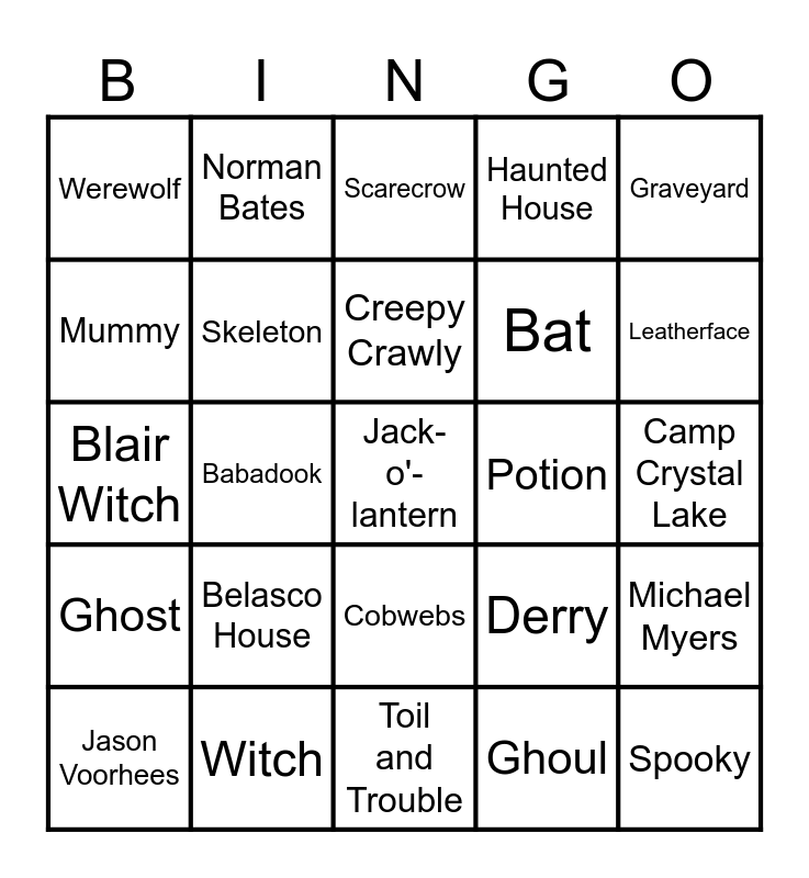 This bingo card has 61 words: Free!, Witch, Vampire, Ghost, Ghoul, Pumpkin, Skeleton, Spider, Bat, Candy Corn, Haunted House, Black Cat, Mummy, Frankenstein’s Monster, Zombie, Werewolf, Jack-o'-lantern, Graveyard, Broomstick, Creepy Crawly, Potion, Scarecrow, Jason Voorhees, Michael Myers, Freddy Krueger, Chucky, Pumpkinhead, Pinhead, Leatherface, Ghostface, Candyman, Zuul, Overlook Hotel, Amityville, Norman Bates, Hannibal Lecter, Jigsaw, Babadook, Samara Morgan, Blair Witch, Dracula, Belasco House, Camp Crystal Lake, Castle Rock, Derry, Cemetery, Hill House, Jerusalem’s Lot, Beetlejuice, Cobwebs, Toil and Trouble, Elm Street, Silver Shamrock, Vampire Lestat, Buffy Summers, Vlad the Impaler, Poltergeist, Grim Reaper, Coffin, Spooky and Cauldron.
