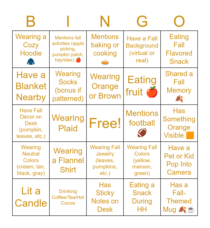 This bingo card has a free space and 24 words: Wearing a Flannel Shirt, Drinking Coffee/Tea/Hot Cocoa, Wearing Orange or Brown, Lit a Candle, Eating Fall Flavored Snack, Wearing a Cozy Hoodie π§₯, Have a Blanket Nearby, Mentions fall activities (apple picking, pumpkin patch, hayrides) π, Mentions football π, Wearing Fall Jewelry (leaves, pumpkins, etc.), Eating fruit π, Have Fall DΓ©cor on Desk (pumpkin, leaves, etc.), Wearing Fall Colors (yellow, maroon, green), Have a Pet or Kid Pop Into Camera, Wearing Socks (bonus if patterned), Eating a Snack During HH, Has Something Orange Visible π§, Mentions baking or cooking π₯§, Shared a Fall Memory π, Wearing Plaid, Has a Fall-Themed Mug πβ, Wearing Neutral Colors (cream, tan, black, gray), Have a Fall Background (virtual or real) and Has Sticky Notes on Desk.